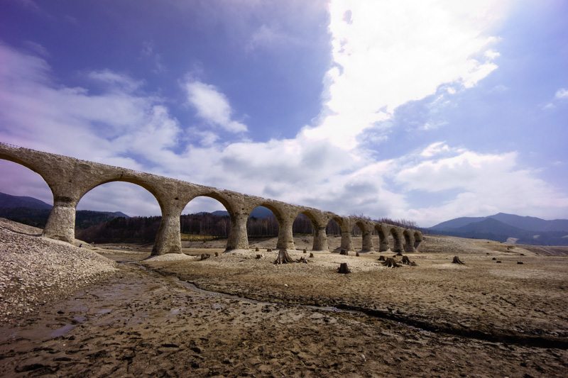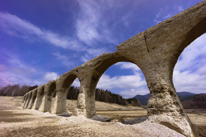ゴツゴツと無骨な表面を持った白亜のコンクリート橋が描くアーチが