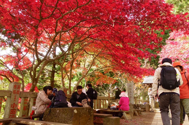 紅葉の天蓋で身支度する登山客だらけだったり。