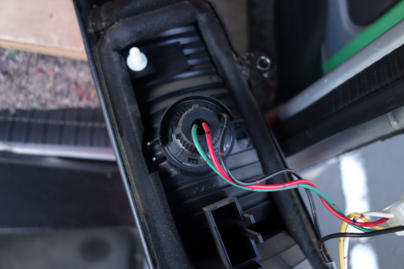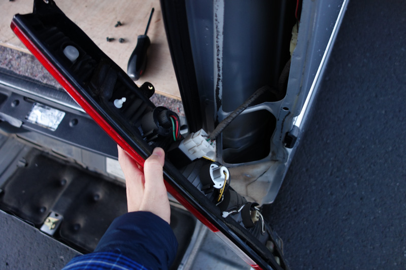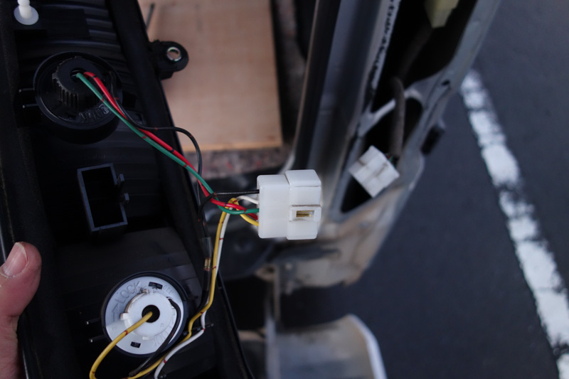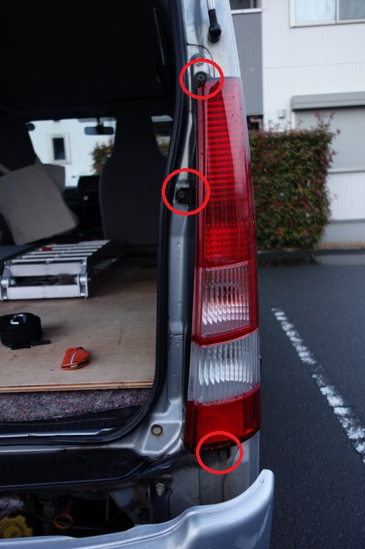 リアゲートを開けて、エンジンフードもといバンパーも開けて、3箇所ネジを外したら、テールランプのユニットが白いプラスチックの突起(プラリベット?)で刺さってるので引っこ抜きます。