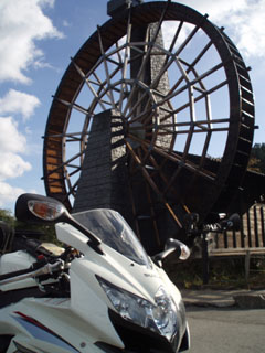 突如、巨大な五連水車が、どどーん! と飛び込んで来る。