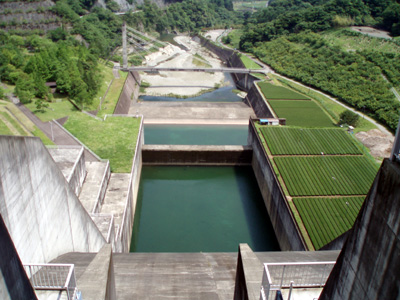 一般的なロックフィルダムとは一線を画した、美しい緑色に彩られた斜面。