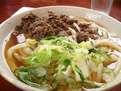 富士吉田うどんおなじみの馬肉、キャベツ、そして超硬派な極太麺。