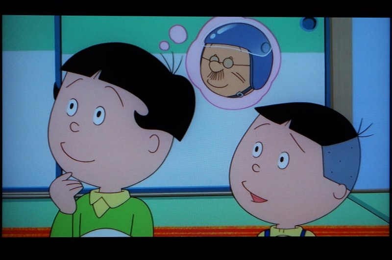 波平さんを唆した住職さんにプレゼントされたヘルメットを被り、ご満悦です。