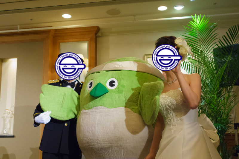 新郎さんの出身地大分が誇るゆるキャラの「めじろん」が駆けつけまして、なんだか途中からは主役そっちのけで、めじろん握手会みたいになってました。