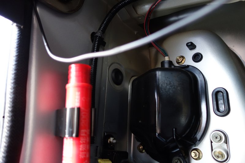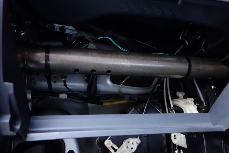 グローブボックスの後ろに、鉄パイプが通っているので、そこにスピーカーケーブルと、垂れ下がってたGPSのケーブルを這わせてタイラップで固定。