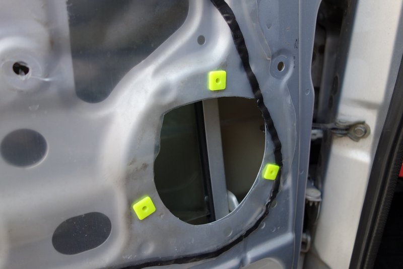 ドアに貼ってあるビニールは、ケーブルを通す部分と、グロメットとクリップを指す部分と、スピーカーをはめる部分に、適宜カッターで穴をあけてグロメット装着。