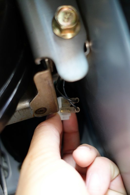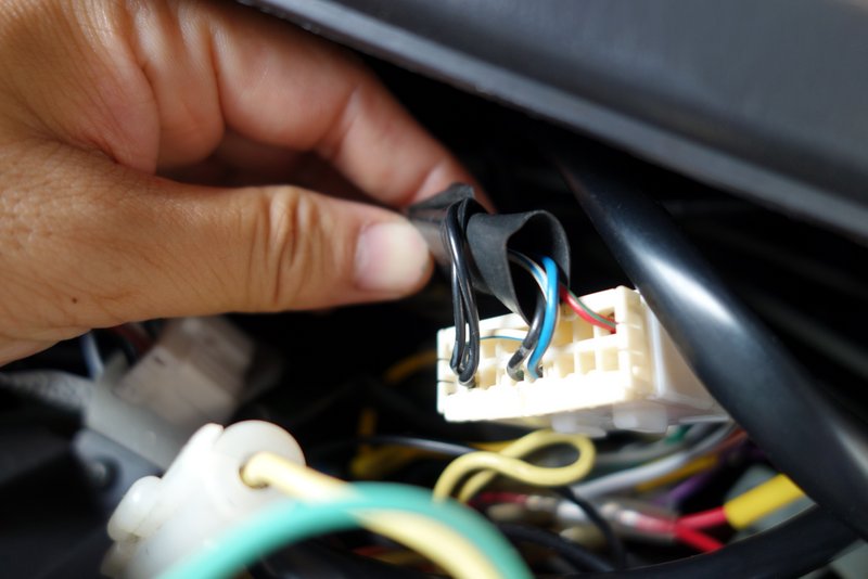 最初、(ちゃんとした?)ハーネスから来てるのかと思っていたけど、よくみると他のケーブルにビニールテープで巻いてあるだけでした。