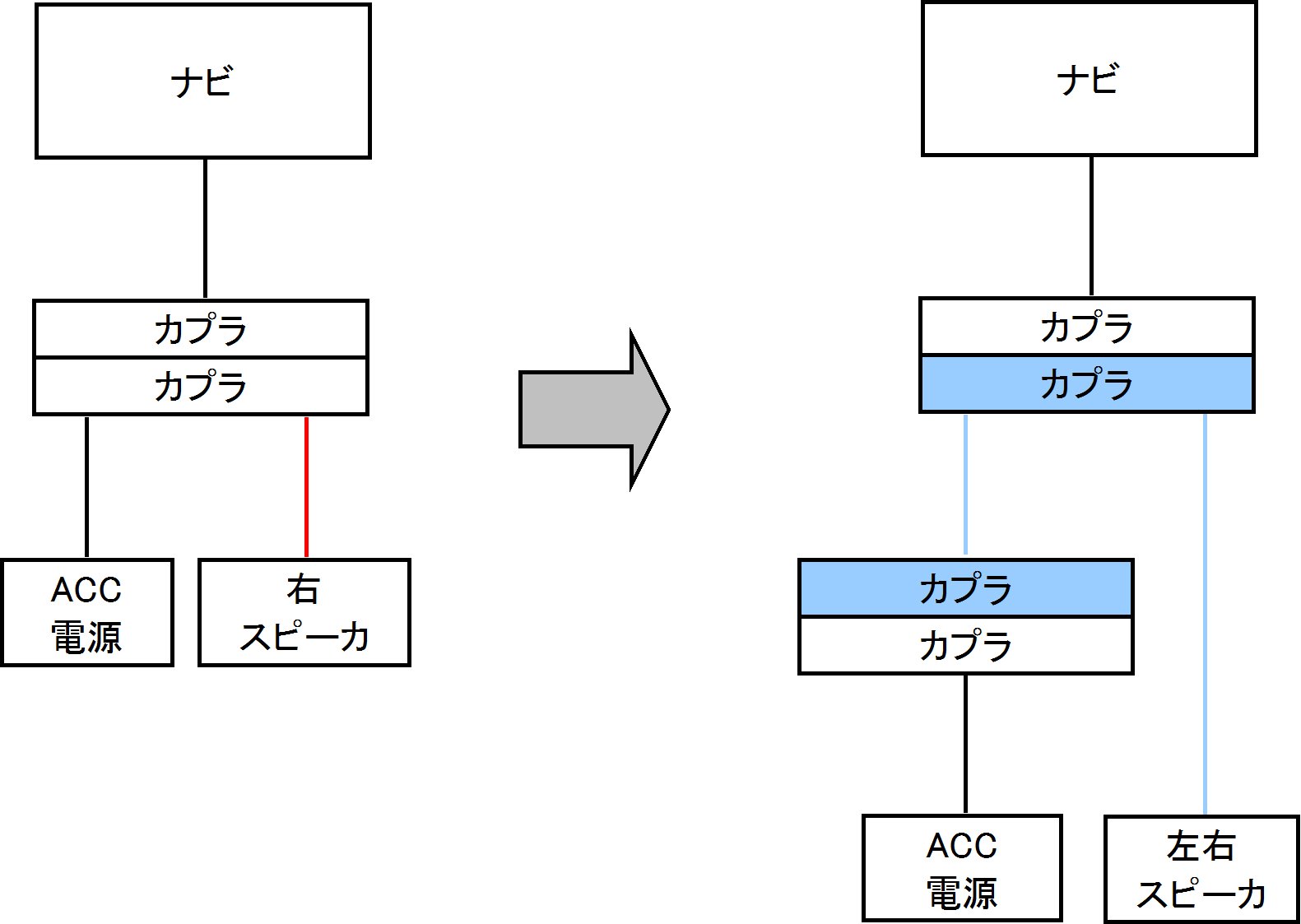 赤い線は捨てて、青い線とカプラ(純正スピーカーケーブル)に置き換えた感じです。