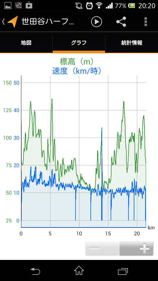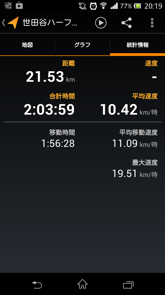 ゴール後、10分程度計測停めるの忘れてしまったので、実際の平均速度は約11.4km/h。