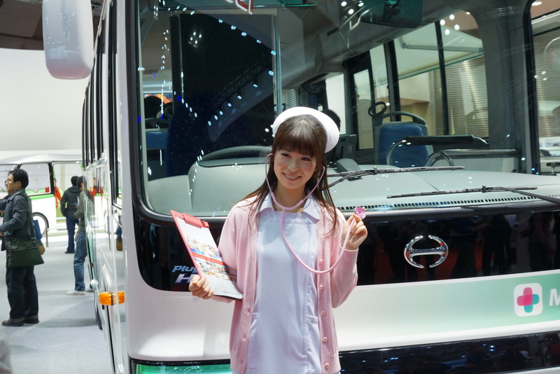 日野自動車の医療車両のとこには、やたらとスタイルが良い白衣の天使が!