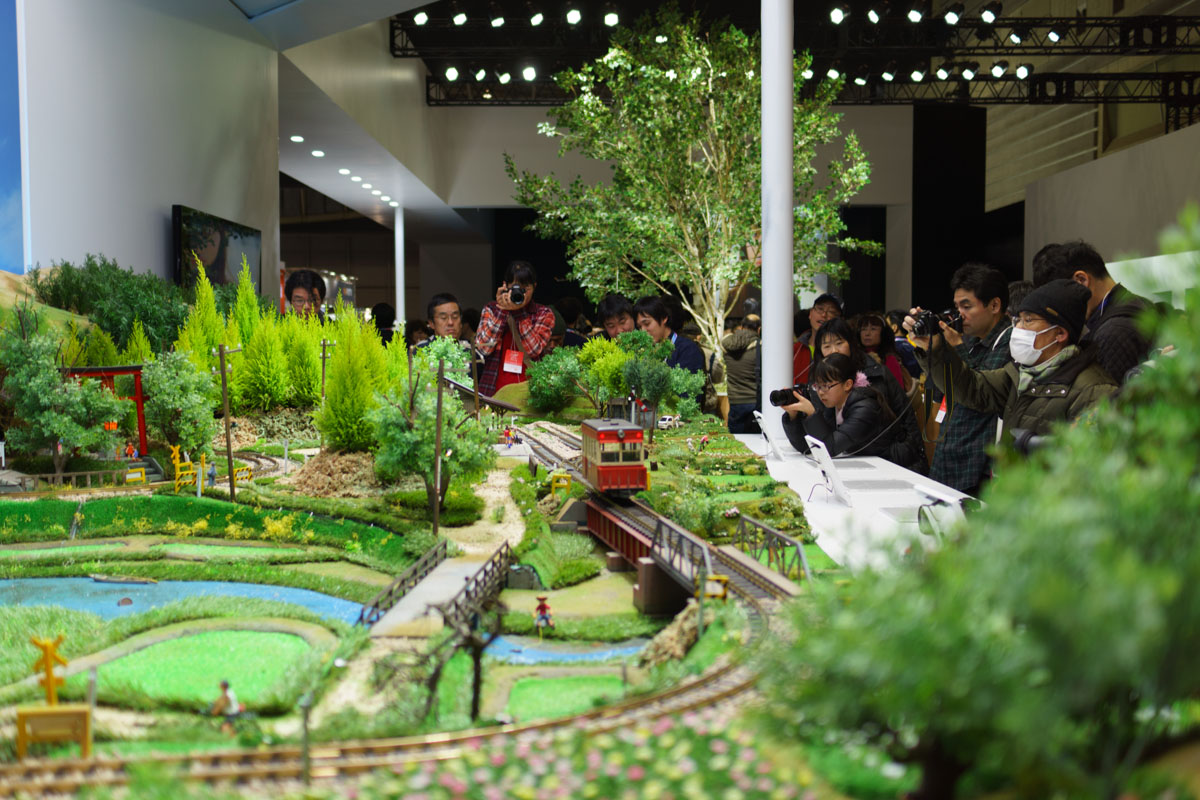 SONYのブースでは、大人気のフルサイズミラーレス機であるα7の、一眼レフに遜色ない優れたたAF追従性能を見せ付けるべく、上空を鷹がくるくると飛んでいたり、ジオラマを電車がぐるぐる回っていたり、大々的なセッが設営されておりました。