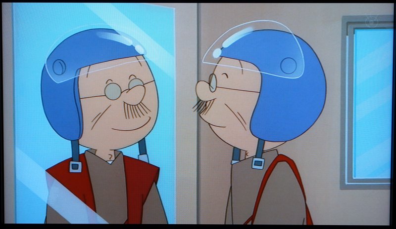 波平さんを唆した住職さんにプレゼントされたヘルメットを被り、ご満悦です。