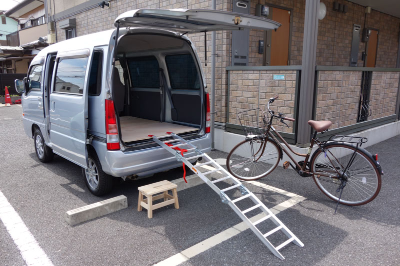まあ、とりあえず踏み台を使って1本で、チャリンコ載せてみよう・・・。