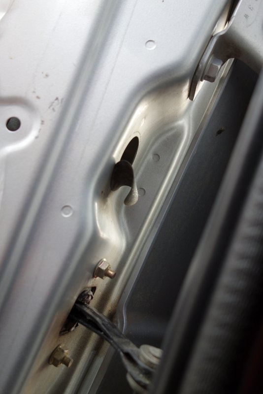 ドアのスピーカーケーブルを通す穴にシールが貼ってあるので剥がします。
