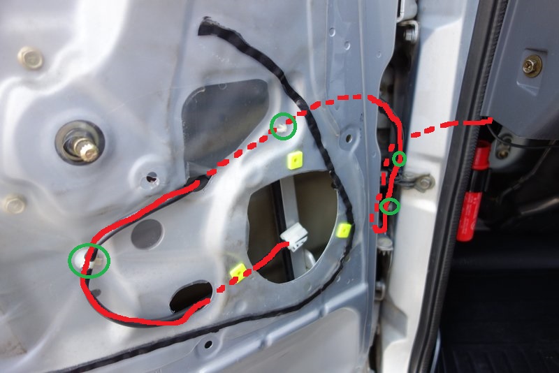 ドアに貼ってあるビニールは、ケーブルを通す部分と、グロメットとクリップを指す部分と、スピーカーをはめる部分に、適宜カッターで穴をあけてグロメット装着。